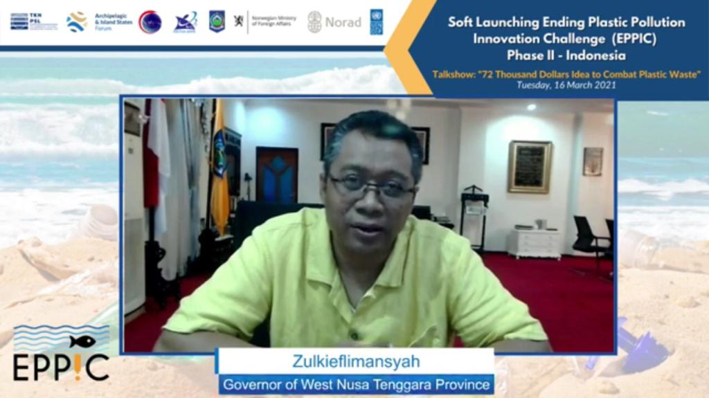(Mataram), Selasa, 16 Maret 2021 diadakan soft launching Ending Plastic Pollution Innovation Challenge (EPPIC) melalui zoom meeting. Kegiatan yang dibuka oleh Gubernur NTB DR. H. Zulkilimansyah tersebut dihadiri oleh Perwakilan dari Norwegia, United Nation Development Program (UNDP) dan Direktorat Jendral Pengelolaan Sampah dan limbah B3 Kementrian Lingkungan Hidup dan Kehutanan. Dalam sambutannya Gubernur NTB menyambut baik kegiatan ini. Bang Zul, begitu akrab dipanggil mengharapkan dari kegiatan ini akan muncul company yang mempunyai inovasi yang serius mengelola sampah plastik. Seperti yang kita ketahui bahwa NTB yang menjadi salah satu dari lima wisata prioritas nasional akan menggelar event internasional yakni pagelaran Moto GP 2021., permasalahan sampah tentunya harus menjadi perhatian yang serius untuk ditangani. Bang Zul juga menambahkan bahwa Provinsi NTB memang memilki program prioritas Zero Waste dalam menangani sampah, namun perlu kolaborasi semua pihak untuk mensukseskannya.