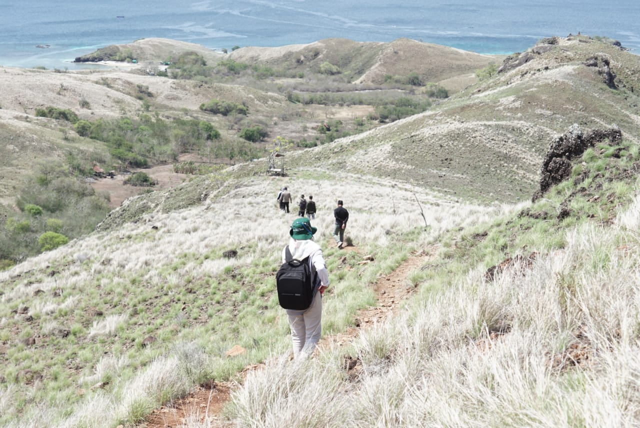 Sesampainya di pulau ini, kita mungkin merasa heran, entah mengapa pulau ini disebut pulau Kelapa, padahal pohon kelapa hanya ada beberapa saja di pulau ini. Kami kemudian bergerak ke arah dataran yang lebih tinggi. Untuk mencapai puncak pulau ini dibutuhkan trekking sekitar 1 jam, namun kali ini lebih lama karena di sepanjang trek kami tidak menyia-nyiakan pemandangan indah untuk berfoto. Hamparan savana di sepanjang perjalanan sangat memanjakan mata. Jalur trekkingnya cukup melelahkan, namun rasa lelah akan terbayar begitu kita sampai di puncak.