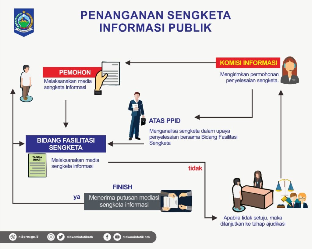 - Sengketa karena alasan tidak disediakannya informasi berkala sebagaimana dimaksud dalam Pasal 9 UU KIP, tidak ditanggapinya permintaan informasi, permintaan informasi ditanggapi tidak sebagaimana yang diminta, tidak dipenuhinya permintaan informasi, pengenaan biaya yang tidak wajar; dan/atau penyampaian informasi yang melebihi waktu yang diatur dalam Undang-Undang KIP harus melalui tahapan Mediasi terlebih dahulu.